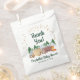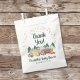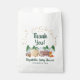 Cute party favour bags for your baby shower featuring a watercolor illustration of woodland animals camping in the mountains and forest, an overlay of gold stars, and "Thank You!" and the mother-to-be's name in a forest green script.