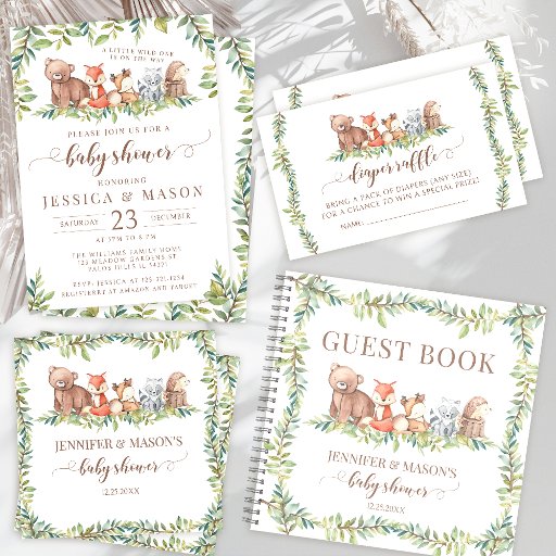 Cute watercolor woodland animals with forest leaves baby boy shower guest book gift notebook, journal.