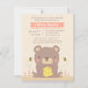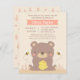 A baby shower invitation with a cute woodland baby bear who is holding on to a honey hive with bees buzzing around it. Decorative leaves in the background. Gender neutral colour palette of browns, yellows and oranges that is suitable for moms to be expecting baby girls and boys! Personalise with your baby shower details.