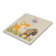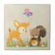 A ceramic tile with a cute illustration featuring a baby deer and a little squirrel holding an acorn and a butterfly flying above their heads. These adorable woodland creatures on standing on some grass with some whimsical mushrooms by their feet. Sandy brown background