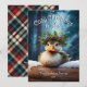 This adorable holiday greeting card features a cute Duck illustration wearing a festive crown wreath of winter flowers, holly, pine, and berries, with snowflakes gently falling against a Snowy winter woodland forest scene. The little Duck is sitting on the snow-capped log to say hello! The playful text "Cosy Christmas Wishes" adds a warm seasonal greeting, and can be customised as you like. The reverse side is decorated with a classic plaid check, adding a traditional touch to the overall design. This cute, playful card is perfect for sending holiday cheer to family and friends, and the customisable name and date make it a personalised keepsake.