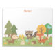 Design comes with a variety of woodland furry animals which include a deer, a squirrel holding to an acorn nut, a hopping bunny, a racoon, a hedgehog, a fox, and a bird on the tree. A welcoming spring forest background with trees, white daisies, red flowers and polka dots mushrooms.