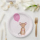 NewParkLane - Personalised Paper Plates, with a soft pink (blush) and white striped design, with a cute woodland mouse in watercolor, with a pink balloon for your personalise text. The background has a playful pink abstract pattern.