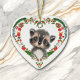 On this ornament, a watercolor image of an adorable little gray raccoon is at the center of a pretty heart shaped Christmas wreath. The wreath is made up of Holiday images, including pine cones, holly sprigs, lollipops, tree bulbs, and Christmas trees. Everything is placed on a white background. The back of the ornament has the same heart wreath, with custom text fields in red and green for you to customize. Perfect for a grandparent to give to a grandchild.