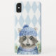 A cute phone case design with a winter theme, this case features an adorable woodland racoon illustration in watercolors. The fox is wearing a blue sweater with matching hat to stay warm on a wintry day. A matching geometric harlequin pattern in blue and white completes the design.