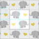 Custom fabric features a grey elephant animal and bright yellow heart pattern with white (can be modified) background colour.