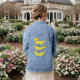 This fun jean jacket features illustrations of three dogs made out of yellow bananas, or banana dogs.