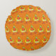 A cute round throw pillow for kids and kids' rooms or nurseries. This orange pillow features a patterned image of a yellow cartoon duck.