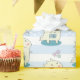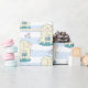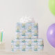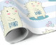 Patterned wrapping paper with a cute smiling dinosaur, pink rosy cheeks and RAWR written on his belly. 3 colourful happy stars above his head.