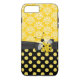 Stylish iPhone 7 Plus case, with a yellow and white damask pattern, on the top of the case and a yellow on black polka dot pattern, on the bottom. Graphics of a black ribbon and bow runs across the case between the two backgrounds and is decorated with graphics of a yellow and black ladybug. Pretty way to protect your iPhone 6 and look stylish too, and makes a great gift idea.