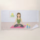 This beach towel features Destei's cute illustration of a pretty woman doing yoga. The woman is in lotus pose and there are two blue candles next to her. Behind the woman there is a simple painting as well.