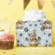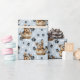 An adorable little Yorkshire Terrier puppy peeking out of a wicker basket is the feature in the pattern on this all occasion gift wrapping paper. The portrait is amid a pattern of black paw prints and white bones, and is repeated on a silver blue background. Perfect for any Yorkie Dog lover!