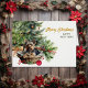 On this Holiday card, an adorable Yorkshire Terrier dog lays in his wicker basket bed in front of a decorated Christmas tree. Also behind the basket is a pretty red holly berry and pine cone bouquet. The gold script text at the right says "MERRY CHRISTMAS", with HAPPY NEW YEAR in green below it. All the text, inside and out, may be easily changed to anything you'd like. You can see more dog images and products at Dog Village.