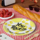 These vibrant paper plates feature a lively design of yellow watercolor spots on a crisp white background, adding a playful and cheerful vibe to any event. The bold slogan "You Rock" is showcased in striking black brush-painted typography, giving the plates a dynamic, edgy flair. The modern text perfectly complements the bright, fun aesthetic, making these plates a stylish addition to your table setting. The back showcases a matching yellow dots pattern, adding a cohesive touch. Plus, there's space for a customisable name and date, offering a personal touch. Perfect for celebrations, they bring a personal, joyful, and uplifting vibe!