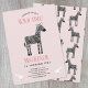 A cute zebra and some birds decorate this blush pink safari first birthday party invitation. The back features a matching zebra pattern.