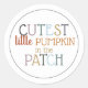 Fun for Fall or Halloween, this round sticker features a stylish and colourful design that reads, "Cutest little pumpkin in the patch."