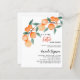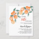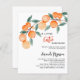 A white. Decorated with watercolored oranges. Personalise and add a name and party details. Text: A little Cutie is on the way.