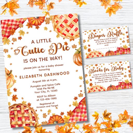 Gender-neutral autumn-themed baby shower "A Little Cutie Pie" is on the way, with watercolor illustrations of pies, pumpkins, fall leaves, and plaid napkins.
