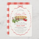 This cute "little cutie pie" girl's baby shower invitation features a strawberry pie with strawberries surrounded by a red bow frame. The reverse side features a white background with red gingham patterns. Personalize it for your needs. You can find matching products at my store.