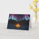 In a snow-covered valley on a frosty night in the dead of winter a bonfire leaps up to mirror the northern lights filling the sky above the distant mountains.