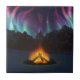 In a snow-covered valley on a frosty night in the dead of winter a bonfire leaps up to mirror the northern lights filling the sky above the distant mountains.