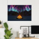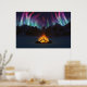 In a snow-covered valley on a frosty night in the dead of winter a bonfire leaps up to mirror the northern lights filling the sky above the distant mountains.