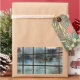A chilly autumn landscape viewed through a frosted window early one morning. Fir and pine trees with ice whitening their needles, maples in shades of red, orange, and yellow, frost-whitened grass seen through the fog rising from a hidden stream. Flanking the window on either side are red-and-green rose leaves.