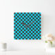 Cyan and charcoal checkerboard pattern square wall clock