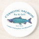 A blue-toned Sockeye Salmon with text reading "Cyanotic Salmon Bar & Grill Kenai, Alaska" and "Combat Fishing Rest And Relaxation. Fishing for salmon is very popular, too popular in Alaska. Imagine hundred of anglers, just about shoulder to shoulder, lining both banks of a stream trying to avoiding crossing lines with everyone else in hopes of landing a big salmon. That's combat fishing. After a day of that take some R&R at the mythical Cyanotic Salmon in Kenai. Fishing tales told there...some true.