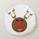 This awesome round pillow features a funny cartoon of a Reindeer. He has beady black eyes and a huge bright red glowing nose. The antlers are pointing up and look futuristic making this reindeer a cyber reindeer. He is still cute and friendly though.