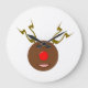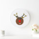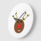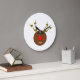This awesome clock features a funny cartoon of a Reindeer. He has beady black eyes and a huge bright red glowing nose. The antlers are pointing up and look futuristic making this reindeer a cyber reindeer. He is still cute and friendly though.