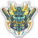 This intricate design showcases a futuristic reimagining of a traditional Japanese Oni mask. The mask features a menacing, cybernetic face with glowing yellow eyes and sharp horns. Metallic elements and wires adorn the mask, suggesting a fusion of ancient mythology and modern technology. Two stylised samurai swords flank the mask, adding to the overall sense of power and aggression. The colour palette of blue and gold creates a striking visual contrast.