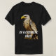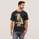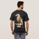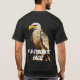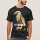 The t-shirt design features a striking cybernetic eagle, blending nature and technology in a futuristic style. The eagle's wings are a fusion of sleek metal and feathers, with intricate mechanical details like gears and circuits embedded throughout its body. Its eyes glow with a neon blue light, giving it a powerful and vigilant look. The design emphasizes sharp angles and a metallic sheen, contrasting with organic curves to create a dynamic, robotic appearance. The background is minimal, keeping the focus on the eagle's imposing, tech-enhanced presence.