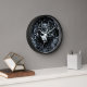 The size of the clock is dramatic and the abstract alcohol ink design is soothing and intricate at the same time. I chose the black frame that adds pop to the blue and gold design. The gold printing would be better in a slightly darker or larger font. I love it and I’m looking for just the right place in ny new apartment. I would recommend this clock for a personal gift or a present. I feel that the quality is excellent for the money! I’m a bit of a clock nut so I’m pretty particular about my purchases. The clock is larger in diameter than many if the clocks I have, so it stands out very well. I think a slightly darker printing color and a moderately larger size would best suit a professional decor or add more impact in a work place item.