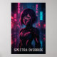Step into a cyberpunk future with this bold anime-style artwork featuring Spectra Override. She wears a dark armoured suit with glowing pink accents and a matching mask, standing against a neon-lit cityscape filled with Japanese signs
