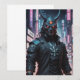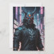 This intense image portrays a menacing demon samurai, adorned with a futuristic, dark outfit and a mask with glowing red eyes and horns. Set in a neon-lit, urban environment inspired by cyberpunk aesthetics, the character stands amidst numerous illuminated signs and symbols, suggesting a bustling, high-tech cityscape.