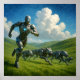 A futuristic cyborg is running across green hills, accompanied by robotic wolves. The scene is set against a backdrop of fluffy white clouds in a bright blue sky.