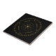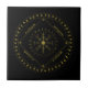 Cycles ceramic tile. Cycles is a Germanic design created by Anna M. Asbury and consists of a black background with an Aegishjalmr in the center and encircled by Elder Futhark Runes. The design is enclosed in a diamond with the Ingwaz Rune, flanked on all four sides with a bind rune, and encircled with the Jera and Ingwaz Runes.