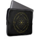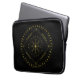 Cycles laptop sleeves. Cycles is a Germanic design created by Anna M. Asbury and consists of a black background with an Aegishjalmr in the center and encircled by Elder Futhark Runes. The design is enclosed in a diamond with the Ingwaz Rune, flanked on all four sides with a bind rune, and encircled by the Jera and Ingwaz Runes.