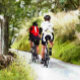 Two road racing cyclists enjoying the country lanes of Wales. Watercolor.
