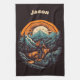 Cycling Life, retro painting in orange and blue of a cyclist riding through the mountains and forest with the sun in the background