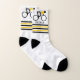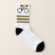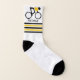Cyclist riding his bicycle socks that displays a minimalist icon of a black cycling silhouette wearing a yellow top and your name with a yellow and black striped border.