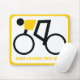 Cyclist riding his bicycle custom mouse pad displaying a minimalist icon of a black cycling silhouette wearing yellow top and your text on white background with yellow border. This cool design is a template and it is completely customisable.