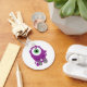 Adorable cyclops monster with one big eye partially covered by one stray curl and with one big buck tooth in Halloween purple and green smailes and waves hello. A cute, festive gift.