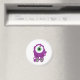 Adorable cyclops monster with one big eye partially covered by one stray curl and with one big buck tooth in Halloween purple and green smailes and waves hello. A cute, festive gift.