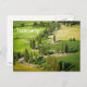 Postcard of a zigzag winding, cypress tree lined road through the green fields in Monticchiello, Tuscany in Italy with the tekst: 'Tuscany'.
