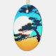 Ornament in a Japanese inspired silhouette of a cypress tree, framing a full moon, against an aqua and coral orange sky