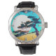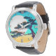 Watch in a Japanese inspired silhouette of a cypress tree, framing a full moon, against an aqua and coral orange sky