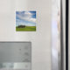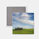 Souvenir fridge magnet with a group of cypress trees in a landscape with green hills and yellow flowers under beautiful white clouds near Torrenieri in the Val d'Orcia (Orcia valley) in Tuscany, Italy.