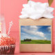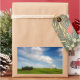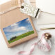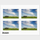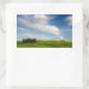 Rectangular photo sticker of a group of cypress trees in a landscape with green hills and yellow flowers under beautiful white clouds near Torrenieri in the Val d'Orcia (Orcia valley) in Tuscany, Italy.